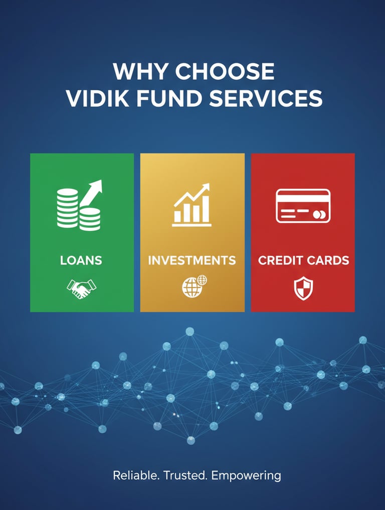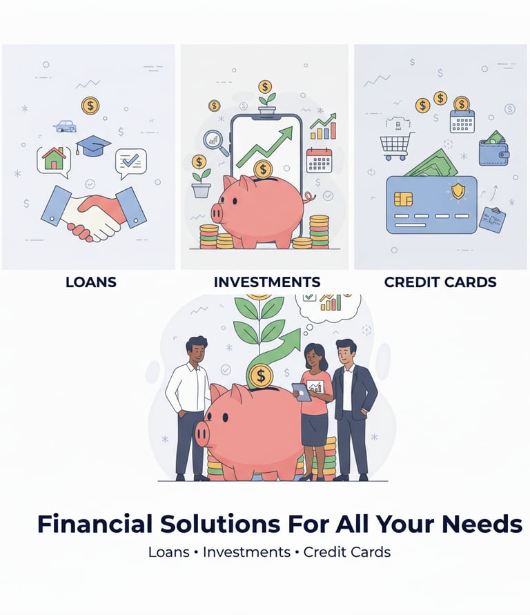 We provide complete financial solutions including all types of loans, credit cards, and investment services such as mutual funds, shares, and demat accounts. Our goal is to make finance simple, transparent, and accessible for everyone. Whether you want to grow your wealth, manage your expenses, or plan for the future — we’re here to guide you at every step.